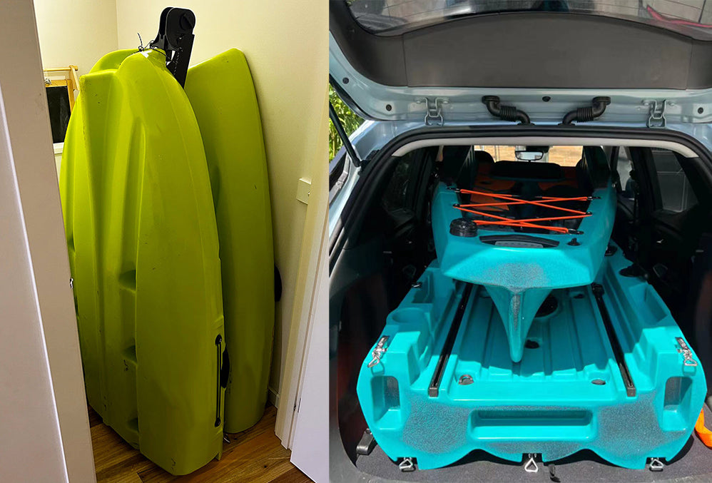 This kayak can be transported in its disassembled form on the back seat of a car, in the trunk or the back of your pick up. We encourage you to check the measurement of the two sections below against your vehicle. It can also be transported in its full form on roof racks, J-racks, trailers, etc.