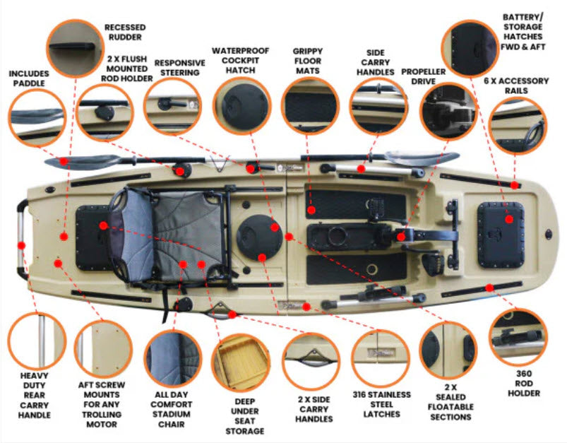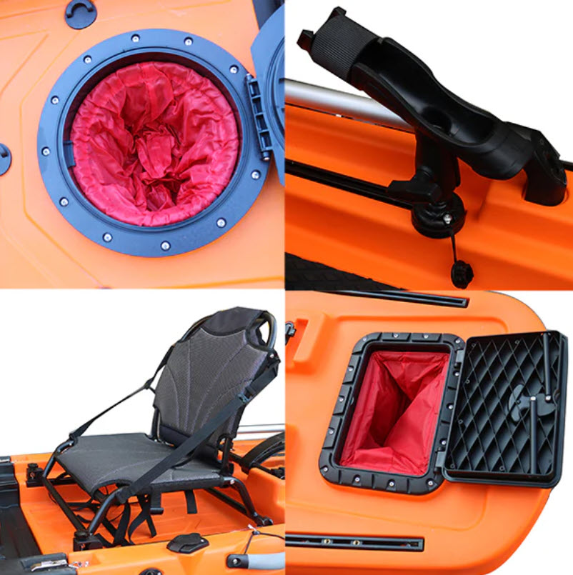 The kayak includes a forward and rear hatch for secure gear storage, plus a small compartment above the pedal drive for keys, phone, or other essentials. An underneath transducer mount keeps electronics safely in place. Built-in front and rear handles, track rails, a swivel rod holder, a deep-bladed rudder, and a comfortable stadium-style seat ensure easy transport, precise handling, and a versatile fishing experience on the water.
