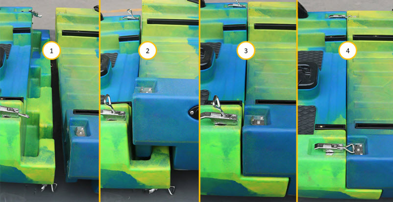 Our Rogue uses an interlocking system with the front section interlocking into the rear and has added security of 2 latches underneath and two latches on top.