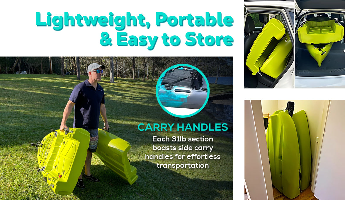 This kayak can be transported in its disassembled form on the back seat of a car, in the trunk or the back of your pick up. We encourage you to check the measurement of the two sections below against your vehicle. It can also be transported in its full form on roof racks, J-racks, trailers, etc.